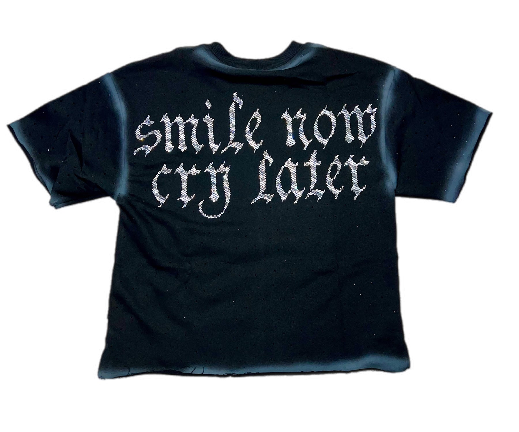 Experience the ultimate in luxury with our Smile Now Cry Later Premium Cropped T-Shirt. Adorned with sparkling rhinestones on both the front and back, this top offers a touch of glamour to any outfit. Made with premium materials, this shirt boasts both style and comfort.