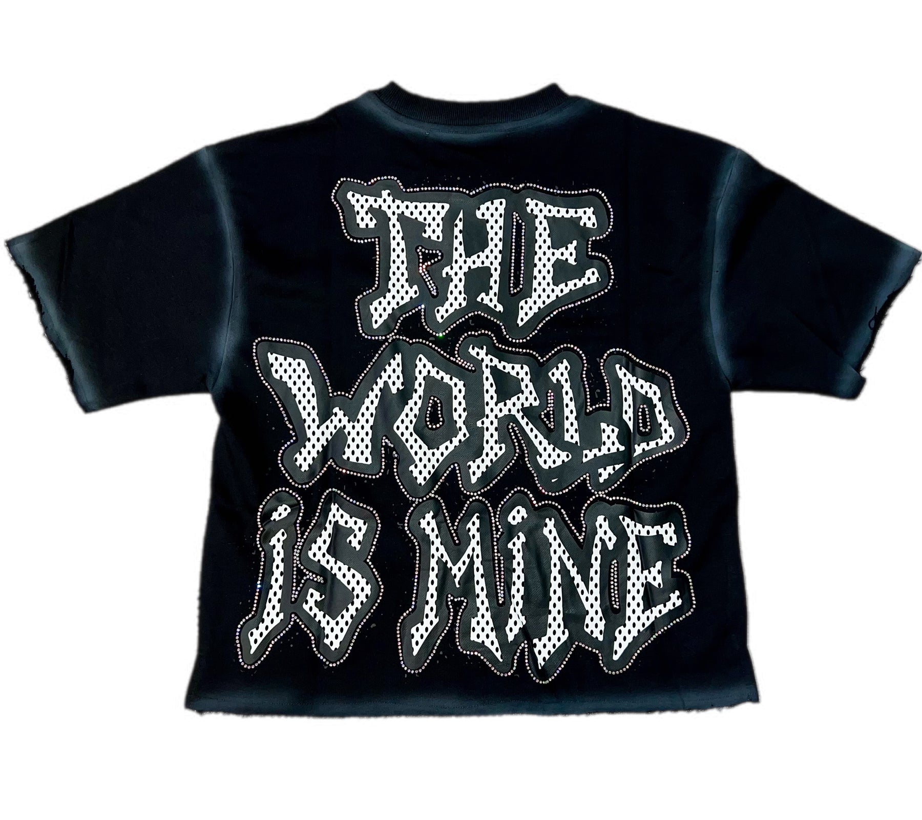This premium cropped t-shirt is designed for the stylish and bold individual who is ready to conquer the world. Featuring sparkling rhinestones on both the front and back, this shirt will add a touch of glamour to any outfit. Be the envy of all your friends with this unique and eye-catching piece.